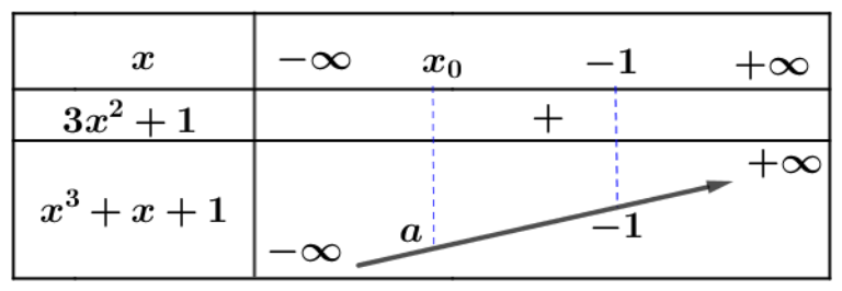 Lập bảng biến thiên của hàm số \[h\left( x \right) = {x^3} + x + 1\] ta thấy với \[a < – 1\] thì phương trình \[{x^3} + x + 1 = a\] có nghiệm duy nhất \[{x_0} < – 1\]