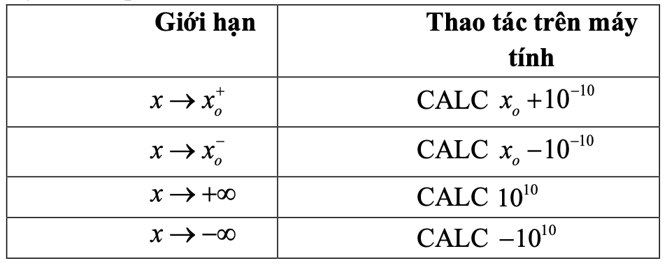 Để tìm tiệm cận đứng hoặc tiệm cận ngang của một hàm số thông qua máy tính CASIO, ta sử dụng phím CALC trên máy.