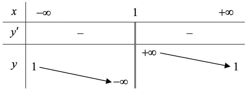 Ta thấy \[{y’}\] không xác định khi \[x = 1\]; \[{y’}\] luôn âm với mọi \[x \ne 1\]