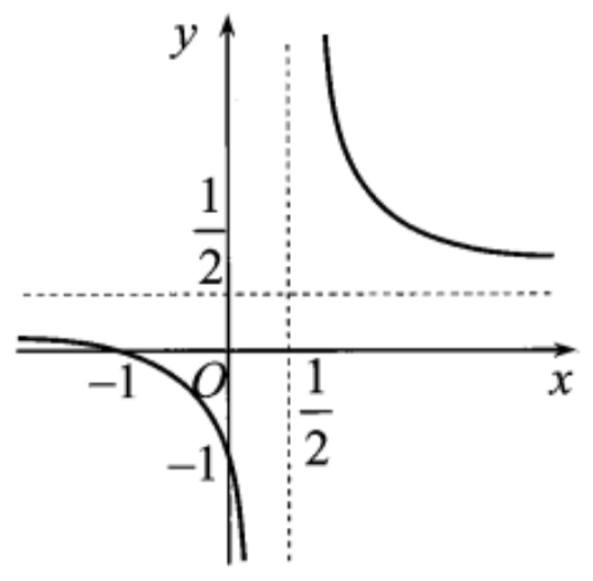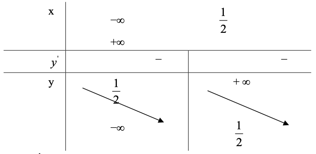 \[\mathop {\lim }\limits_{x \to {{\left( {\frac{1}{2}} \right)}^ + }} y = + \infty ,\mathop {\lim }\limits_{x \to {{\left( {\frac{1}{2}} \right)}^ – }} y = – \infty \]. Đồ thị hàm số có tiệm cận đứng là \[x = \frac{1}{2}\]