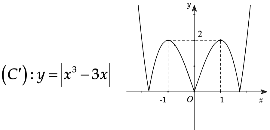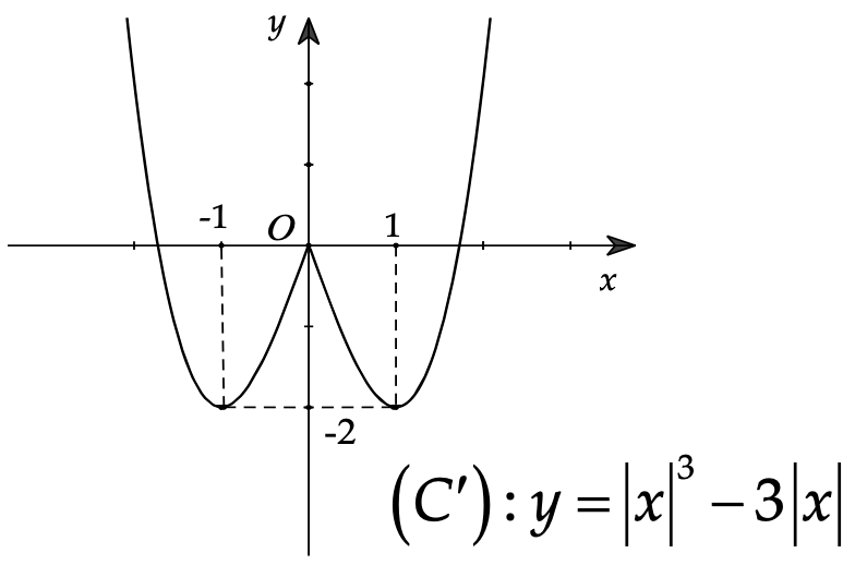 Biến đổi \[\left( {C’} \right):y = {\left| x \right|^3} – 3\left| x \right|\] ta được đồ thị \[\left( {C”} \right):y = \left| {{{\left| x \right|}^3} – 3\left| x \right|} \right|\]