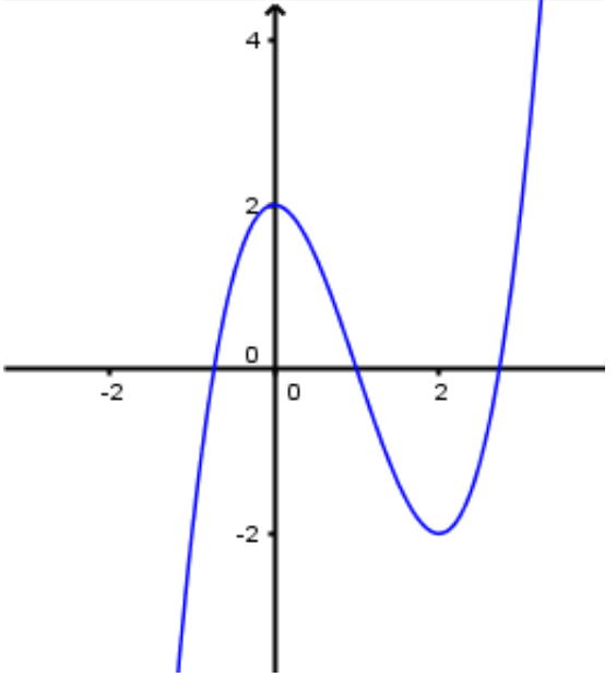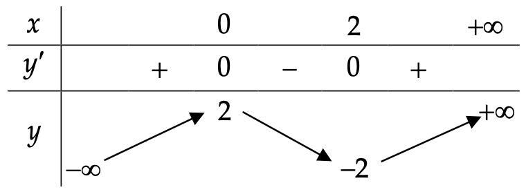 Hàm số đạt cực đại tại \[x = 0;{y_{C\rlap{–} D}} = y\left( 0 \right) = 2\]. Hàm số đạt cực tiểu tại \[x = 2;{y_{CT}} = y\left( 2 \right) = – 2\]