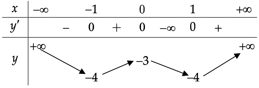Hàm số đạt cực tiểu tại \[x = \pm 1;{y_{C\rlap{–} D}} = y\left( { \pm 1} \right) = – 4\]