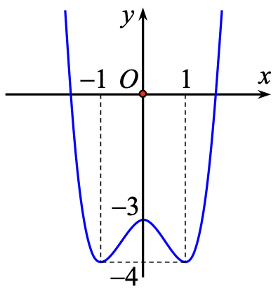 Ta có: \[{x^4} – 2{x^2} – 3 = 0 \Leftrightarrow x = \pm 1\]. Vậy đồ thị hàm số qua \[A\left( {1;0} \right),B\left( { – 1;0} \right)\]